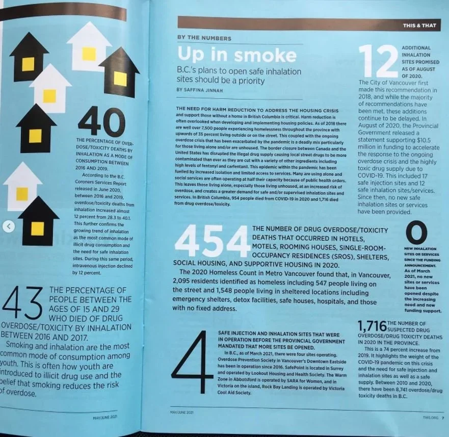 The need for harm reduction to address the housing crisis and support those without a home in British Columbia is imminent. Harm reduction is often overlooked when developing and implementing housing policies. As of 2018 there are well over 7, 500 people experiencing homelessness throughout the province with upwards of 35 percent living outside or on the street. This coupled with the on-going overdose crisis that has been exasperated by the pandemic is a deadly mix particularly for those living alone and/or are unhoused. The border closure between Canada and the United States has disrupted the illegal drug supply causing local street drugs to be more contaminated than ever as they are cut with a variety of other ingredients including high levels of fentanyl and carfentanyl. This epidemic within the pandemic has been fuelled by increased isolation and limited access to services. Many are using alone and social services are often operating at half their capacity because of public health orders. This leaves those living alone, especially those living unhoused, at an increased risk of overdosing and creating a greater demand for safe and/or supervised inhalation sites and services. In British Columbia, 954 people died from COVID-19 in 2020 and 1,716 died from drug overdose/toxicity.